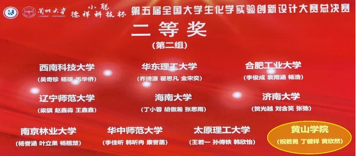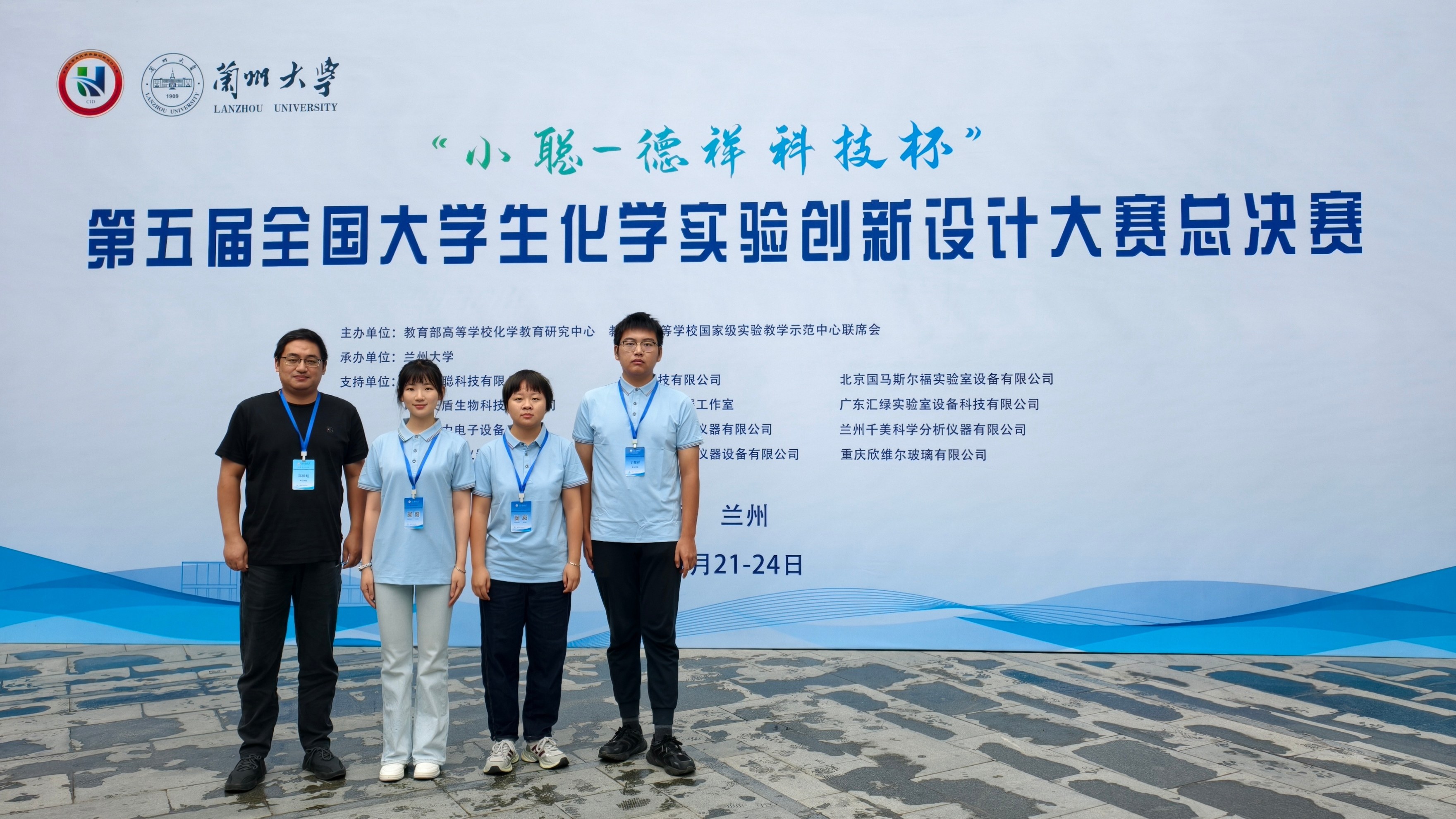 2025年8月21日-24日,“小聪-德祥科技杯”第五届全国大学生化学实验创新设计大赛总决赛在兰州大学成功举办。全国七个赛区482所高校1364支队伍经赛区初赛后,共91支队伍参加总决赛。安徽省共有6只队伍参加总决赛,365英国上市官方网站作为唯一一支学院代表队参赛,祝若男、丁健祥、黄欣然三位同学凭借出色的创新设计、扎实的实验技能和精彩的现场答辩,荣获全国总决赛二等奖,取得了365英国上市官方网站在该项国家级赛事上的历史性突破。
