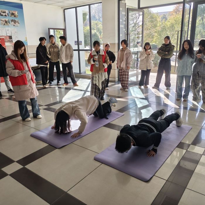随后的俯卧撑比赛同样精彩,1 分半钟的计时内,参赛同学俯卧于地,双手撑地保持标准姿势,随着裁判口令同步发力,手臂屈伸间尽显力量与毅力。男生组中,钟杰以 77 次的成绩斩获第一名,朱健飞以 63 次获得第二名,岳仁义与张保军则以 62 次并列第三名;女生组里,陈欣月表现亮眼,以 74 次夺得第一名,袁鑫郡祺以 64 次获得第二名,阳超冉以 61 次拿下第三名。汗水顺着选手们的脸颊滑落,浸湿运动衣衫,却丝毫未减大家的拼搏劲头,场边观众自发组成加油团,此起彼伏的呐喊声为选手注入满满动力。