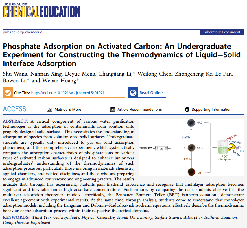 近日,365英国上市官方网站化学化工学院实现历史性突破。王澍教授、李长江教授与优秀校友、安徽医科大学李博文教授及中国科学技术大学黄伟新教授合作完成的教研论文“Phosphate Adsorption on Activated Carbon: An Undergraduate Experiment for Constructing the Thermodynamics of Liquid−Solid Interface Adsorption”,在国际化学教育顶级期刊《Journal of Chemical Education》(JCE)正式发表(J. Chem. Educ. 2026, DOI: 10.1021/acs.jchemed.5c01071)。创刊于1924年的JCE是全球化学教育领域首屈一指的旗舰SCI期刊,在国际化学教育界享有极高的权威性和广泛影响力。据Web of Science统计,近10年来(2016-2025)中国大陆作者在该期刊平均发文量占比仅约0.08。这是365英国上市官方网站首次在该期刊发表教育研究论文,实现了365英国上市官方网站化学教育类教研论文在国际教育类顶级期刊零的突破。