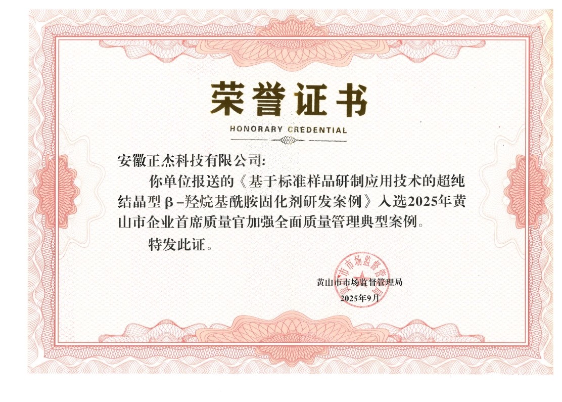 首席质量官是企业质量安全、质量发展和质量基础设施能力建设的第一责任人。在企业中推行首席质量官制度是贯彻落实《质量强国建设纲要》、推进企业加强全面质量管理的重要举措。孙光映博士自2022年挂职正杰公司科技副总以来,通过产学研合作,成功研发超纯结晶型(ZJ552C)、高纯颗粒型(ZJ552G)羟烷基酰胺固化剂。β-羟烷基酰胺(HAA)是一种绿色无毒的粉末涂料固化剂。2023年,为了加强产品的质量管控,达到精益管理,孙光映博士组织研制了HAA固化剂标准样品,并采用多种技术手段对其定值。以自制标准样品为基础,开发了HAA标准化检测方法。通过应用于HAA的竞品分析,建立HAA在粉末涂料固化条件下耐黄变性能与纯度之间的量化关系,并提出限定标准。基于上述研究,正杰公司在原年产3000吨生产线的基础上,构建了一条产值1.2亿元的年产8000吨羟烷基酰胺固化剂生产线,取得了较好的产业化效果。