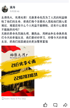 4月5日,因疫情原因,我院在线上举办“花飨逝者,春暖斯人”清明推文评论活动,化学化工学院团总支在微信公众号推出活动专题页面,师生可通过关注公众号进入清明节活动通道。活动中,同学们利用电脑、手机访问公众号,通过推文了解清明节并在评论区发表对先烈的追悼。